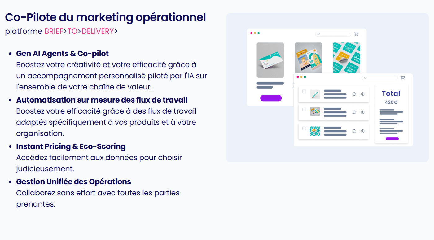 L'Enfer Technique (Print) "Quel grammage ? Quel vernis ?" Les marketeurs ne sont pas des imprimeurs. La peur de se tromper paralyse la commande et génère des allers-retours techniques interminables avec les fournisseurs. | Expertise Automatisée La plateforme digère la complexité technique. Elle recommande automatiquement les spécifications adaptées au besoin. Le marketeur choisit un résultat, la plateforme gère la technique. |